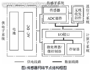 典型的传感器网络体系结构通常由分布的传感器节点、接收发送器、互联网和用户界面等构成。其中,传感器节点作为网络中的独立工作实体,其基本的功能子系统包括供电子系统、传感子系统、计算子系统和通信子系统等,如图1所示。