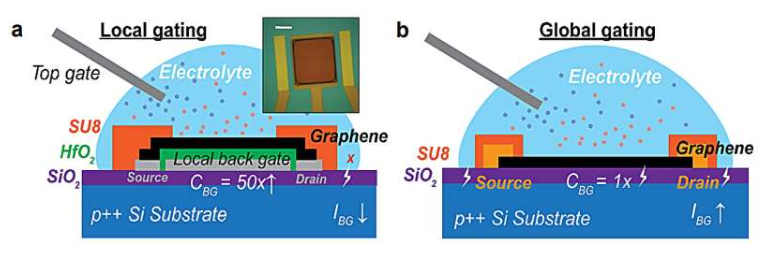(a) 双门 GFET 示意图,具有独立的顶栅和局部模式的后栅,并采用固态 HfO2介质,使得两面都能实现电容调制。插图:制造设备的光学显微照片(比例尺:30微米)。(b) 传统全局反向门控GFET与厚SiO的比较示意图2介质。图片来源:npj 二维材料与应用(2026年)。DOI:10.1038/s41699-026-00674-5
