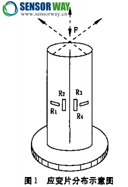 由以上分析可知,圆柱体轴向就是最大正应变 处,圆柱体的环向即为最大负应变处。贴片时,在轴 向贴两片应变片,在环向贴两片应变片,可获得最大 的灵敏度,贴片方法如图1所示。
