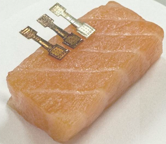 为了制造传感器,团队制作了一个四乘四的微针阵列,并涂覆了专用的金纳米颗粒和一种能分解HX的酶。传感器被压入鱼体表面,并由微针固定。随着酶分解HX,鱼体内的电势发生变化,传感器会测量并解读这些变化。